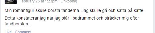 För övrigt är det intressant hur man lär känna sina skrivkamrater och testläsare efter ett tag. Det var ingen överraskning att Thomas inte dyker ner i detaljer, att den Sara som varit med från början slår ner på logiska luckor eller att Linda har mycket fokus på karaktärsutveckling. Av vår nya Sara har jag inte fått kommentarer tidigare, men hon pekade på några saker som jag tagit för självklara men nog borde förklara och det hoppas jag att hon fortsätter med.
